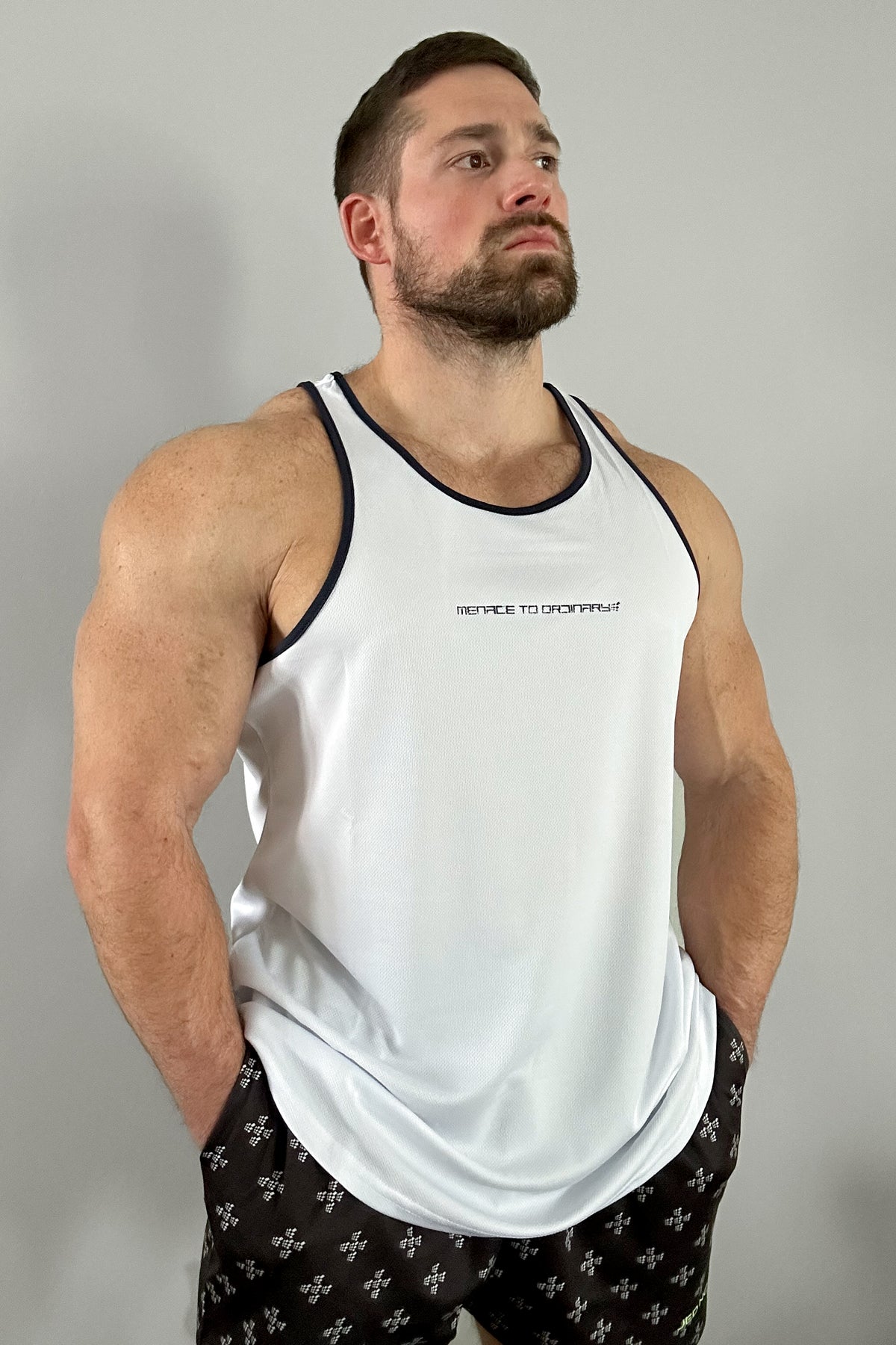 Fast-Dry Bodybuilding Workout Stringer - White w/ Navy Menace